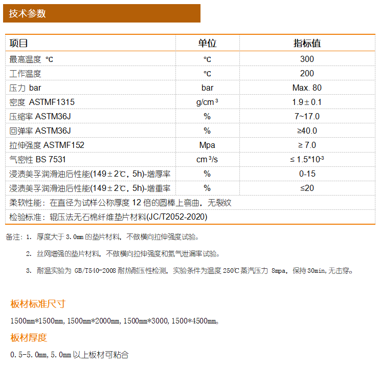 产品描述:由芳纶纤维、合成矿物纤维,耐油胶粘剂的特殊配合,添加相应的功能助剂,经过高温辊压而成的密封板材,具有普通耐温耐油性,一般抗张性和良好的气密性。