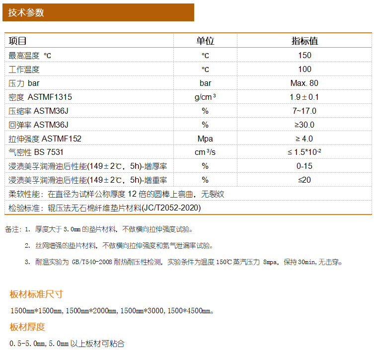 产品简介:由芳纶纤维、合成矿物纤维,耐油胶粘剂的特殊配合,添加相应的功能助剂,经过高温辊压而成的密封板材,具有普通耐温耐油性,一般抗张性和良好的气密性。