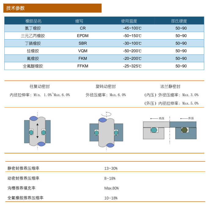 产品简介:由各种弹性橡胶通过模具成型的橡胶 O 型圈。主要用于法兰形式连接的静密封结构, 如陶瓷,玻璃,搪玻璃以及钢制法兰的连接; 旋转动密封用,如电机以及输送泵,离心泵等;往复动密封使用,如油缸的活塞,活塞杆以及柱塞;仪表的密封使用等。